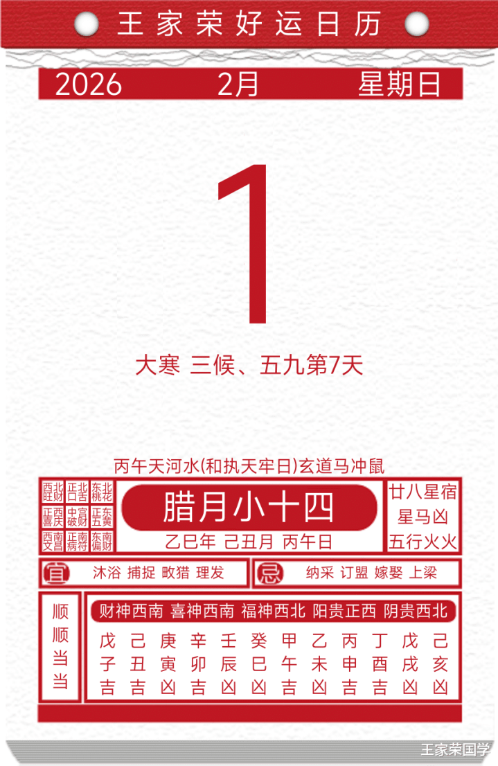 神煞宜忌:大葬,鸣吠,不守塚,守日,明星,解神,敬安,月害,月忌,独火,木马,破败,四废,五虚,荒芜,大时,大败,咸池,土王用事,专日 沐浴,捕捉,入宅,覃恩,雪冤,赴任,整手足甲,诉讼,恤孤茕,祭祀,出行,结婚姻,宴会,嫁娶,安床,剃头,修造,求医疗病,上表章,上官,冠带,进人口,竖柱上梁,经络,开市,纳财,修置产室,开渠,穿井,安碓硙,平治道涂,破屋坏垣,畋猎,栽种,牧养,破土,安葬,启攒,布政事,营建,颁诏,招贤,上册,取鱼,立券交易,补垣,修宫室,鼓铸,塞穴,选将,求嗣,祈福,筑堤防,修饰垣墙,酝酿,解除,整容,出师,苫盖,庆赐,纳畜,施恩,宣政事,举正直,搬移,纳采,裁制,缮城郭,安抚边境,乘船渡水,临政,修仓库,开仓